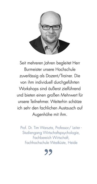 Weiterhin verfüge ich als Haupt-Trainer Erfahrungen als: Personalentwickler mit Verantwortung für über 4500 Mitarbeiter europaweit; Studium der Wirtschaftspsychologie sowie aktiver Tätigkeit als Dozent an unterschiedlichen Hochschulen z.B. FH Fresnius, FH Westküste.